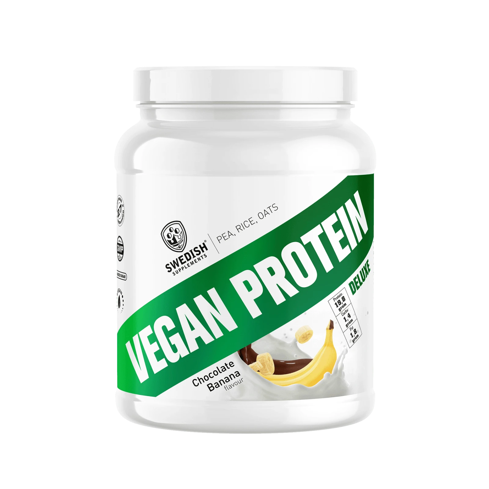 Er du på jakt etter et ekstra luksuriøst og godt protein som dessuten er vegansk, bør du prøve Vegan Protein Deluxe fra Swedish Supplements. Dette produktet kombinerer erteproteinisolat og risprotein i en delikat blanding der hver porsjon gir 20 g protein.